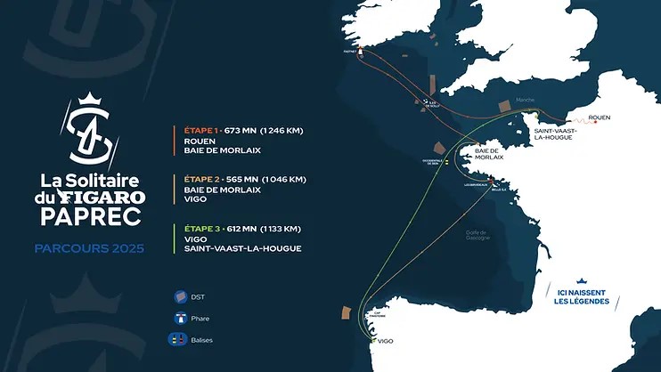 Procedentes de la Bretaña francesa, desde la Bahía de Morlaix —a la entrada del Canal de la Mancha—, y tras doblar el faro de Birvideaux, al norte de la isla atlántica de Belle-Île-en-Mer, la flota pondrá rumbo a Finisterre, descendiendo luego la costa gallega hasta alcanzar las Rías Baixas. Será una etapa de 565 millas náuticas (1.046 kilómetros), con entrada oficial entre los faros de Tofiño y Borneira, que marcan el acceso al Puerto de Vigo.